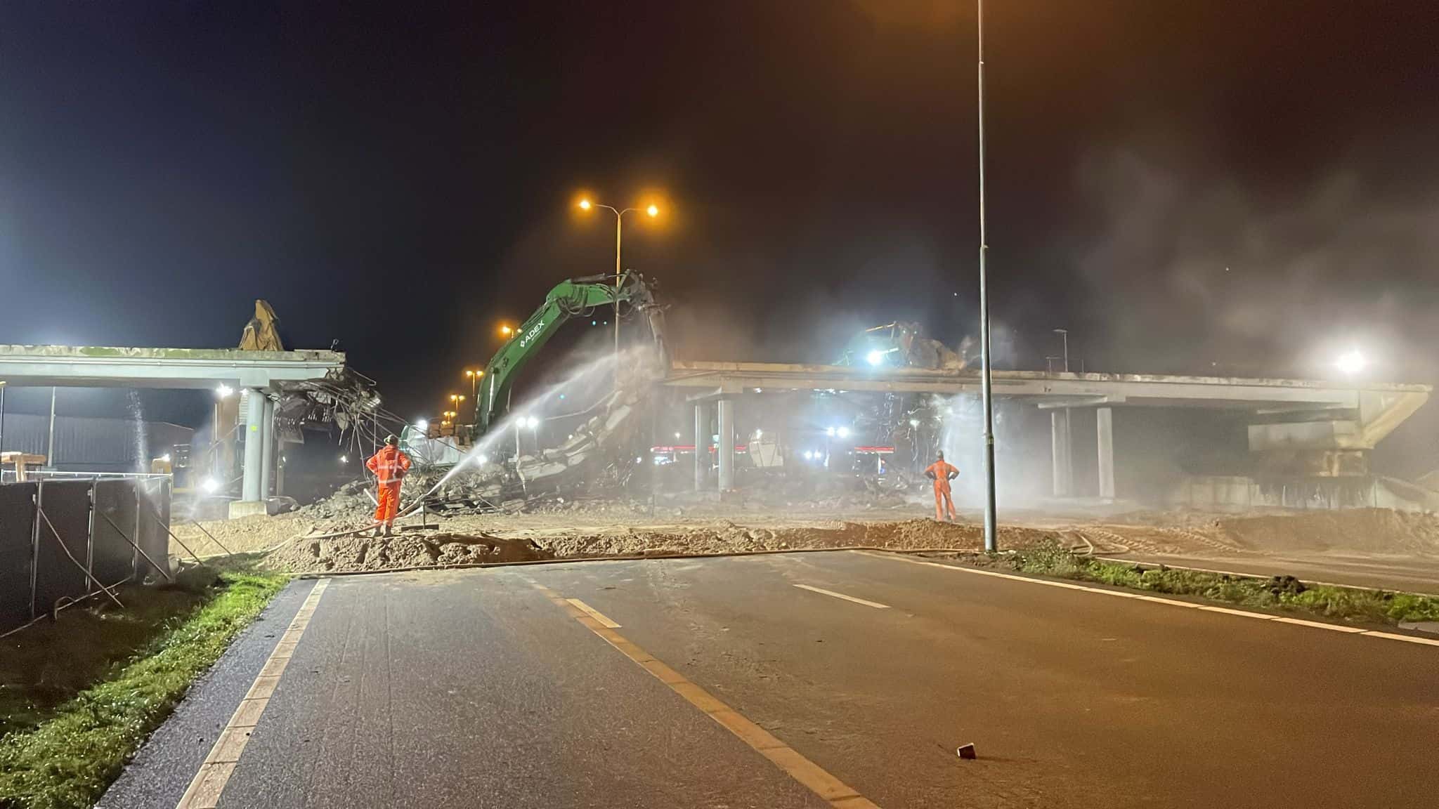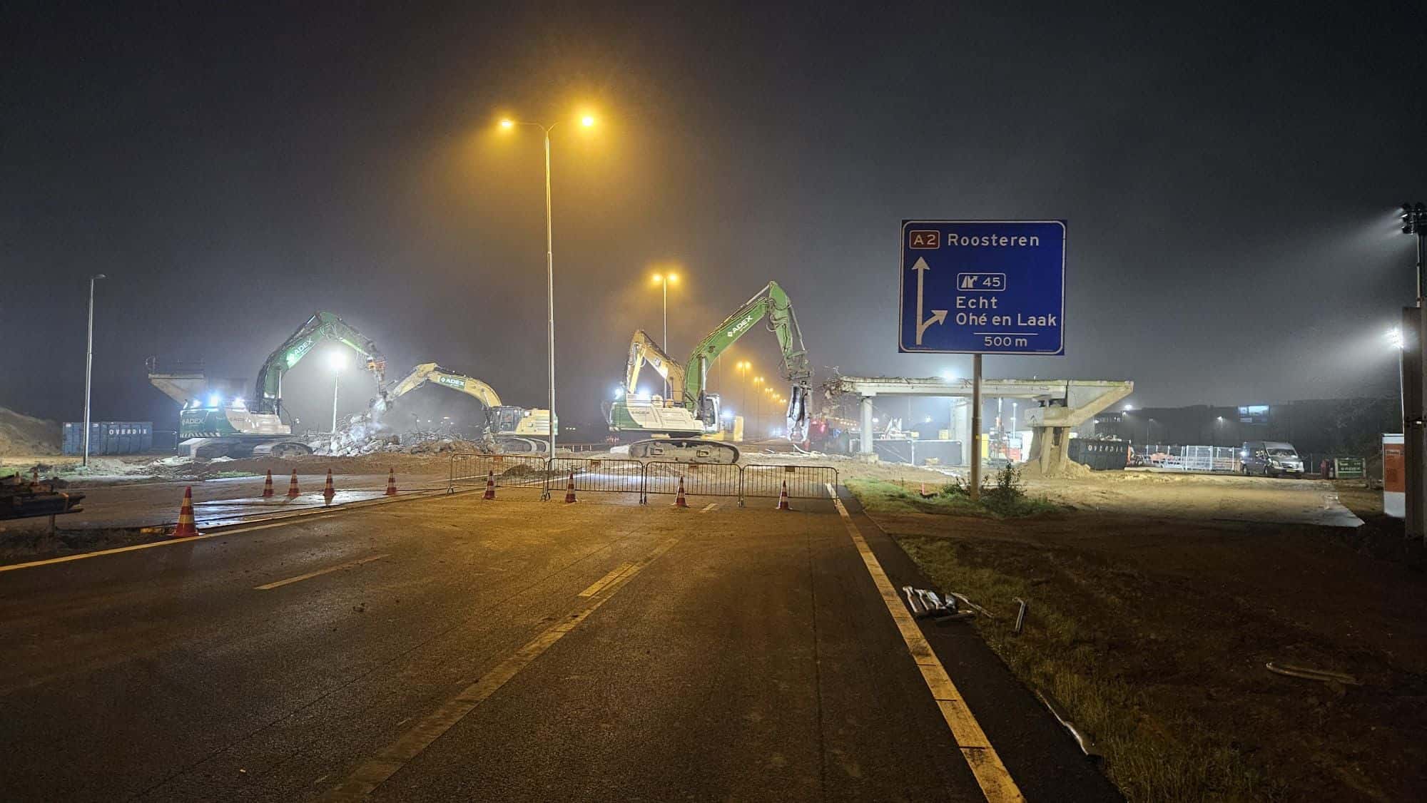 Goedemorgen! De nacht is gebruikt om de weg vrij te maken voor de nieuwe infrastructuur door het uitvoeren van grootschalige sloop en verwijdering van bestaande elementen. Zo is er een start gemaakt met de sloop van viaduct Slagmolen in Echt, de veetunnel bij de Oude Lakerweg in Echt en viaduct ‘t Rooth. Ook zijn de nachtelijke uren essentieel geweest voor funderingswerk en het aanleggen van riolering en kabels. Nu kan de dag beginnen. Zometeen komt de pers op bezoek en de PBM’s (persoonlijke beschermingsmiddelen) liggen al klaar!